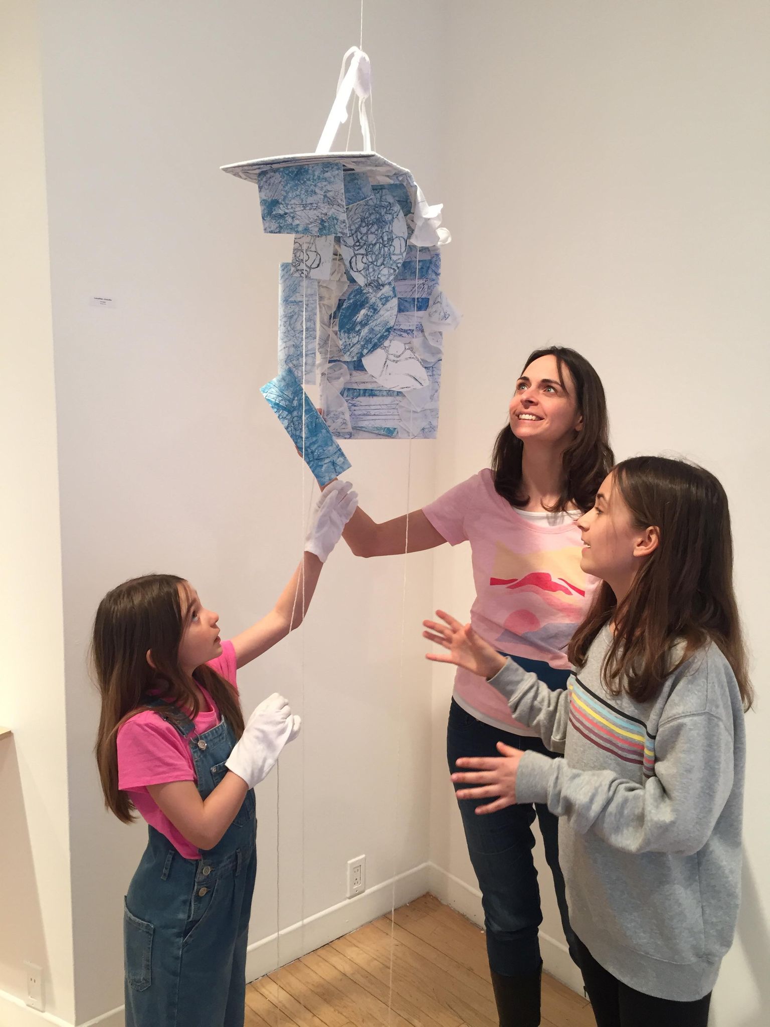 En suspension, les trois cordes tombent jusqu’au sol formant une colonne triangulaire s’intégrant aux éléments imprimés. Une des trois cordes est en avant-plan et son point d’attache est caché par un élément imprimé. L’observateur curieux d’en connaître l’origine doit s’approcher, se trouvant à avoir une